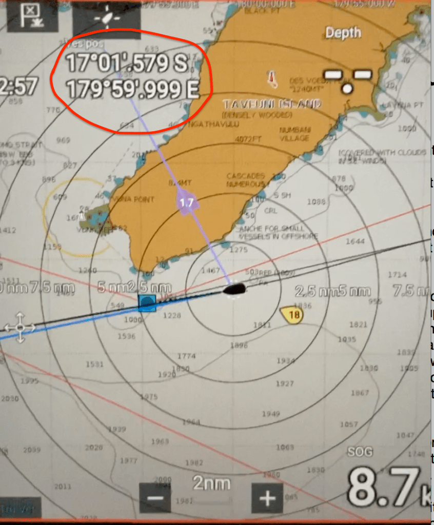 Like Phileas Fogg we forgot about the International Dateline – which for the landlubbers amongst you is not the local version of Tinder. It’s where East meets West and you can skip a day just by crossing a line. This is the actual moment of crossing…