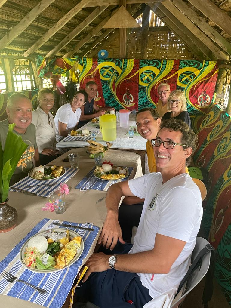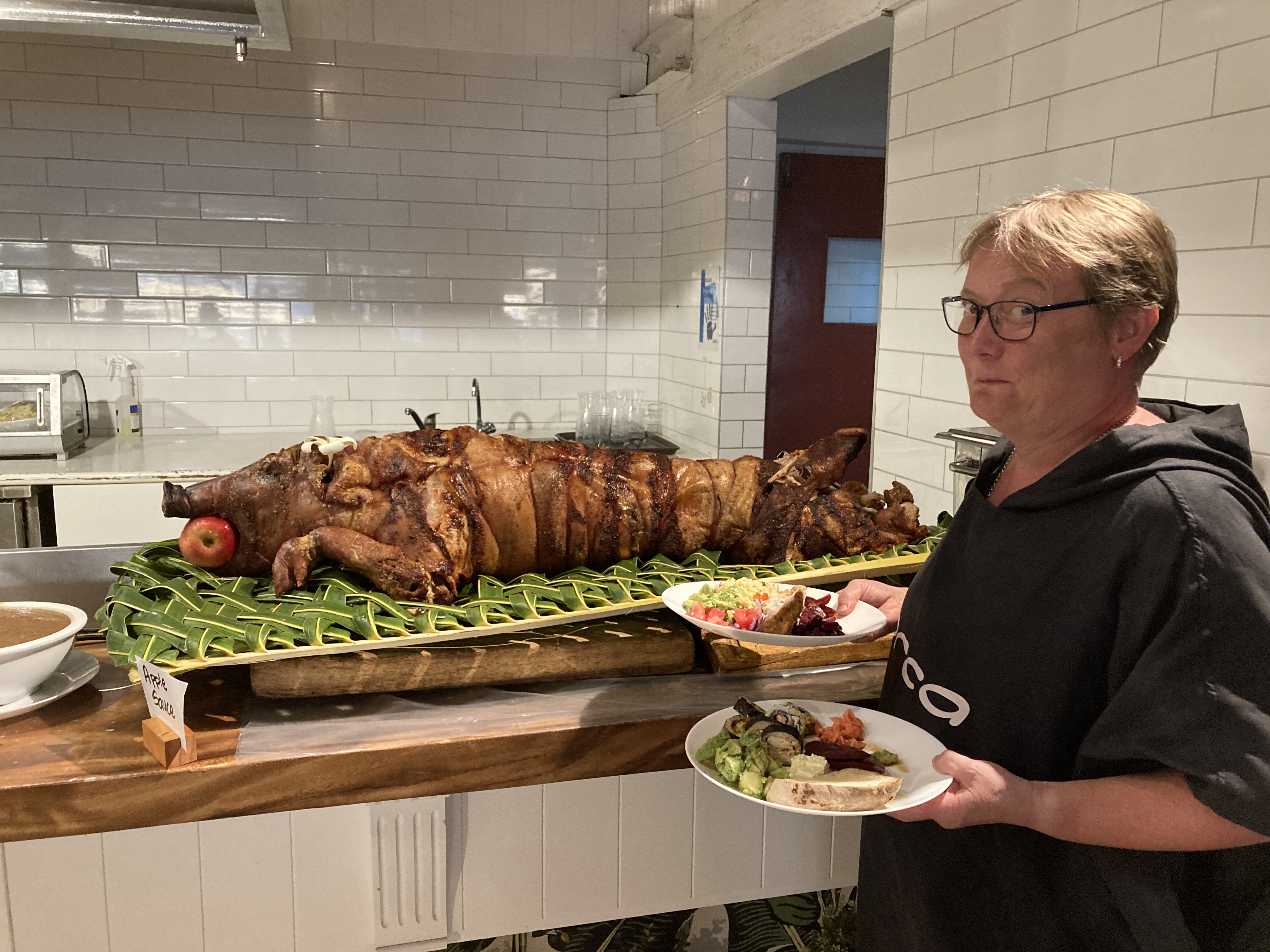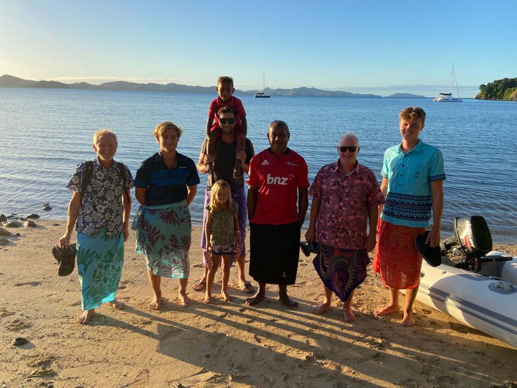 Fortunately for us, the day the we arrived there was an important festival going on. The roving church minister was coming to the island and they were all looking forward to hearing The Word of God. As part of the preparations for his arrival, they had arranged an enormous feast, and Domini and Atreju were lucky enough to be invited. They asked us to dress for dinner, so using some of Lyn’s sarongs we improvised a traditional sulu, which is the Fijian skirt that the men wear for special occasions.