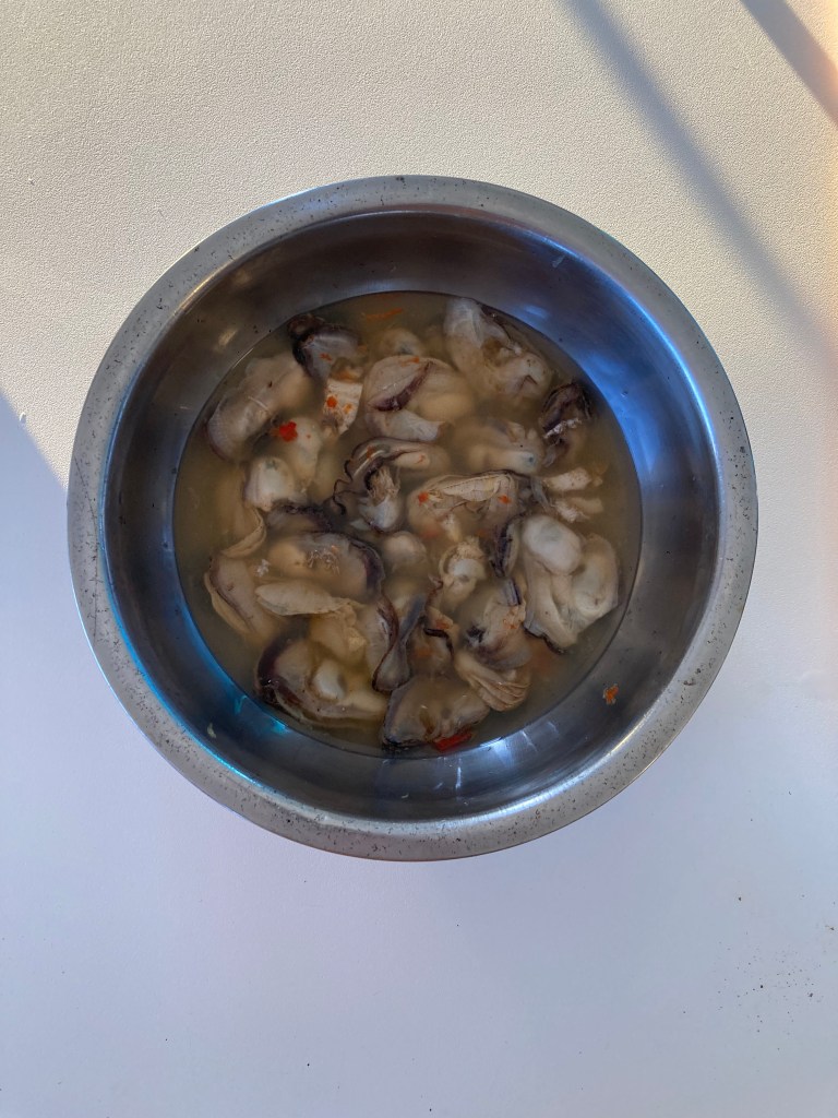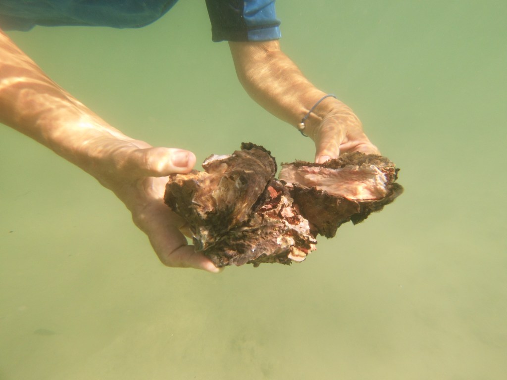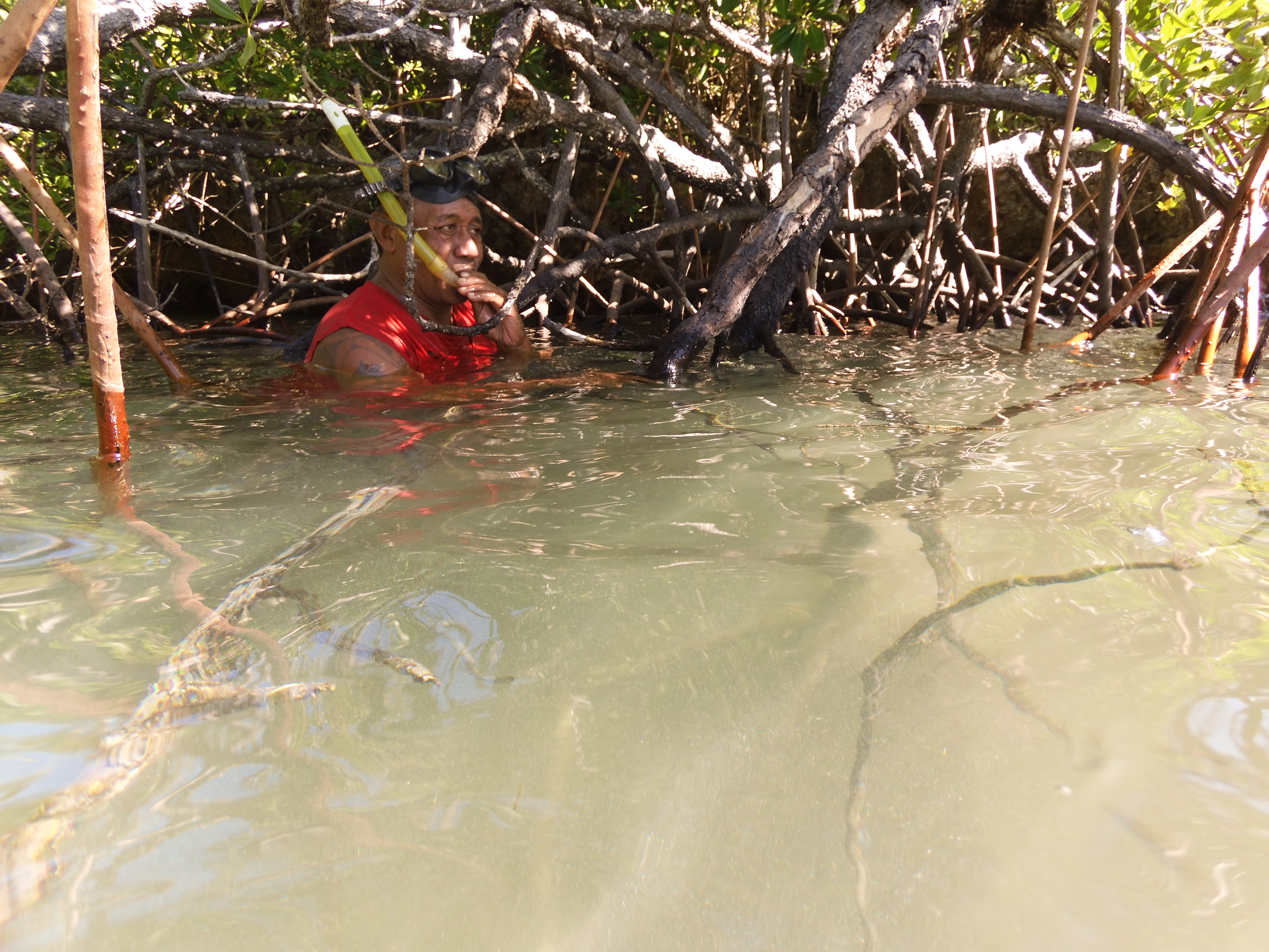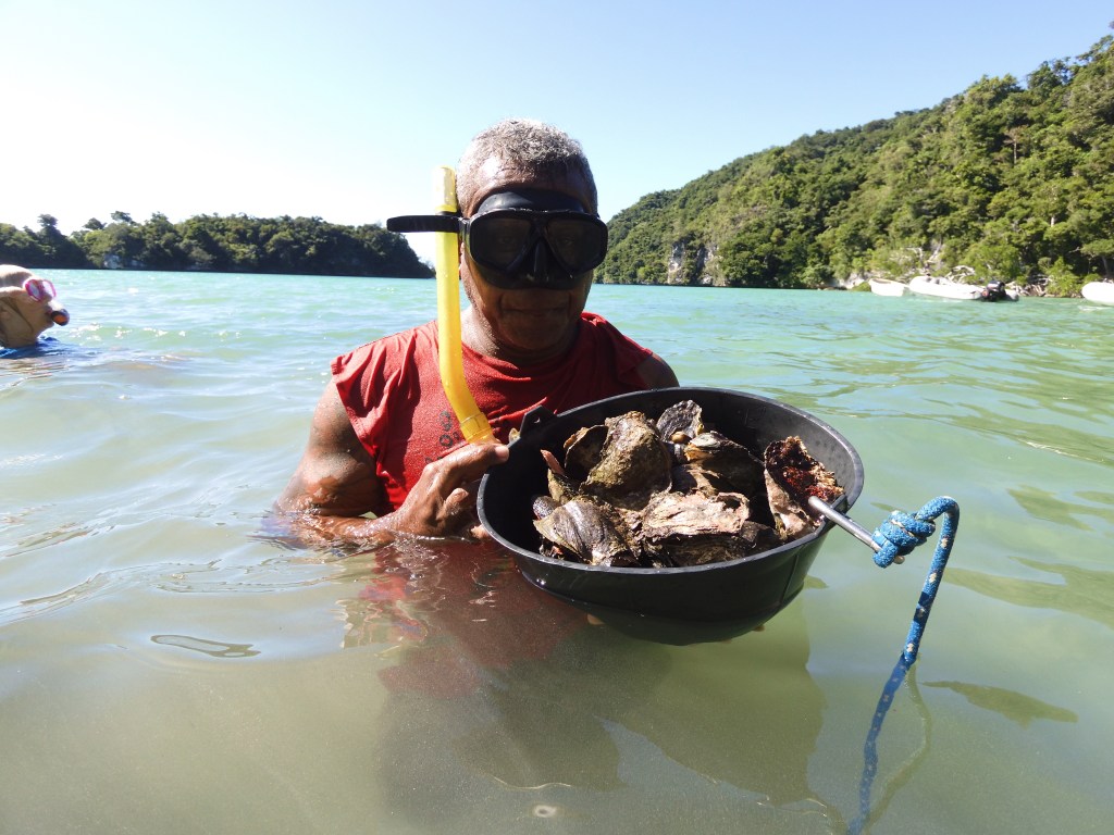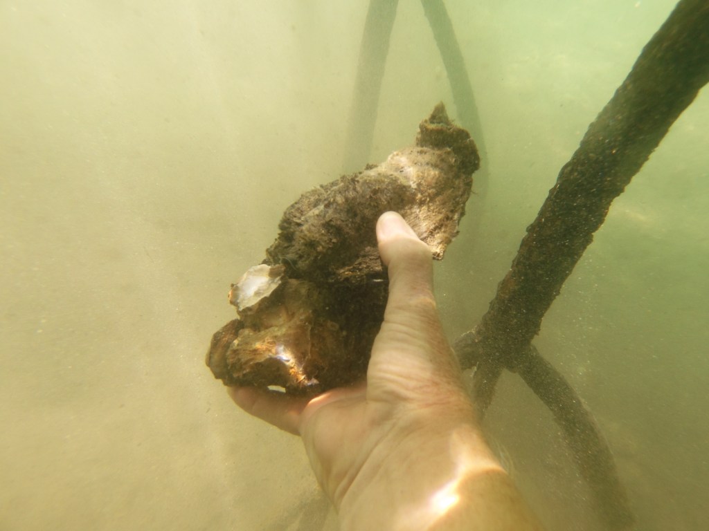 The oysters grow on the mangroves and you have to dive under the roots and then whack them off with a hammer.